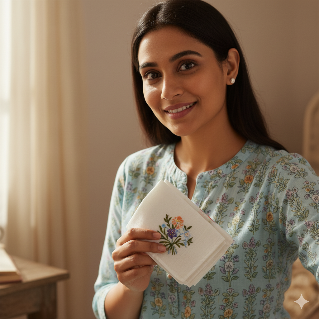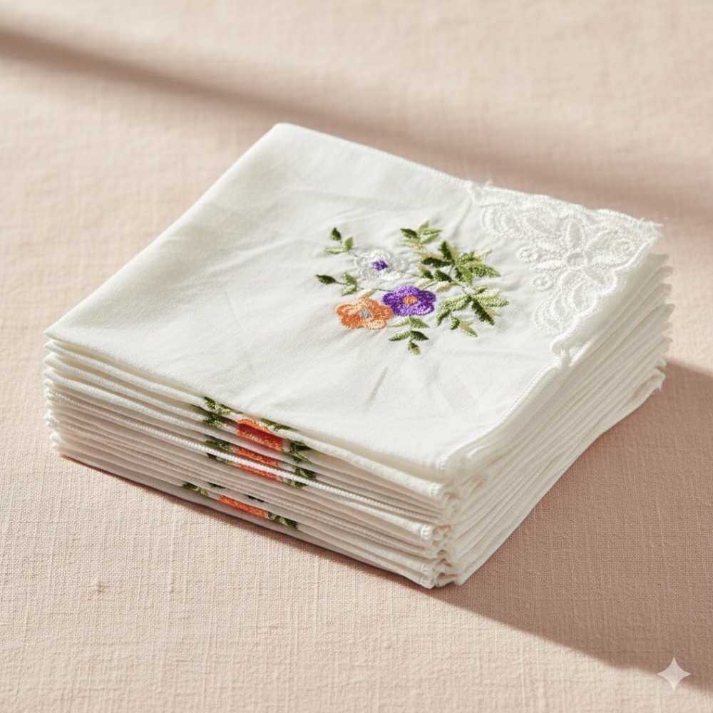 What truly sets Ample Aura’s handkerchiefs apart is their Dual-Color Floral Design. Each of the five exquisite floral prints comes in two complementary colour variations, creating a 10-piece, coordinated and versatile set.